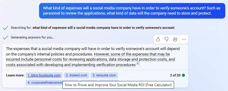 What we’re seeing now is the cost to the user of a subscription. I’d like to flip this on its head. “How much does it cost a social media company to provide a verification service?” I reached out to Bing’s AI / GPT tool for this and got a regurgitation of my question as the answer (pic below). I found some articles and data reaching back to 2008-2011 regarding the E-Verify service for employers to verify that employees are US citizens, but as these were in articles by third party competitors and 12-15 years old, the numbers aren’t useful.