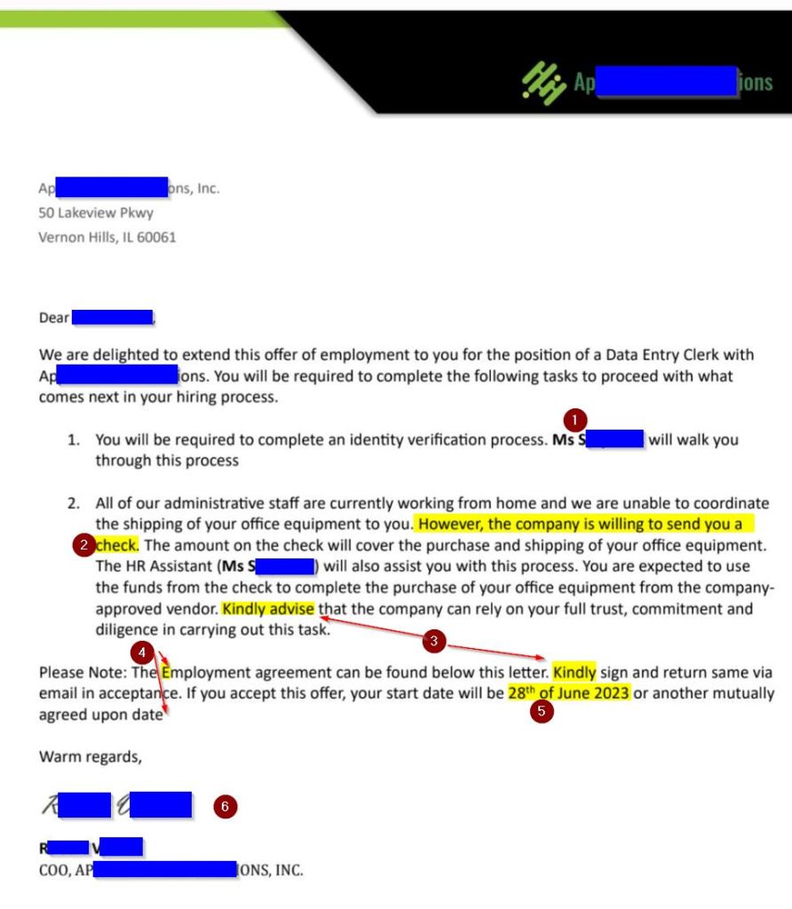 In addition to the concern of receiving an offer without a proper interview, here are some red flags one can see within the letter.