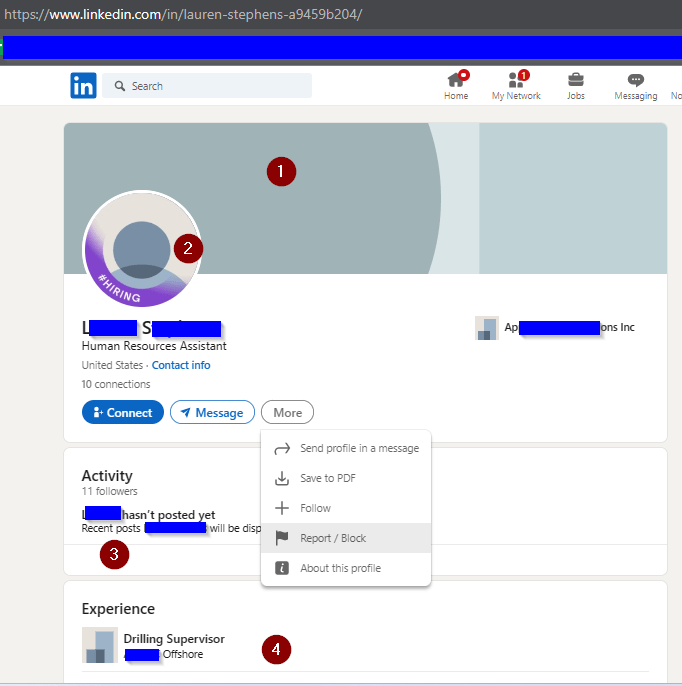 The LI profile of the “HR Assistant” has 1) no cover photo, 2) no profile photo, 3) no activity, and 4) only experience is an unrelated job. Not shown: The profile’s interests are in two UAE Sheikhs and 5 companies that all seem to fit the same clues as this one above.