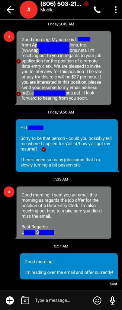 The friend, like me, is seeking a new job. So, a text coming in with an offer to apply, followed by a job offer email, is pretty tempting.