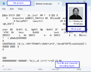 They can do this because, at the end of the day, anything we send by computer is broken down to MANY ones and zeroes. You don’t send an actual image. You send a piece of gobbledygook (like my photo on the right, as seen in Notepad) that tells the other computer, “Hey. This is an image. It’s 640 x 480. At position (0,0), the color is light gray…” My dark brown / black hair doesn’t start until like (4,230). (PS: Not all photos start (0,0) at top left.)