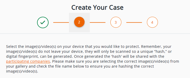 On the site, you can select up to 20 source photos. The tool creates a hash of the images, and only sends this hash to social media outlets. These outlets who have made partner agreements with SWGfl will scan their platforms for the matching hash, and if they find a match, they remove it.
